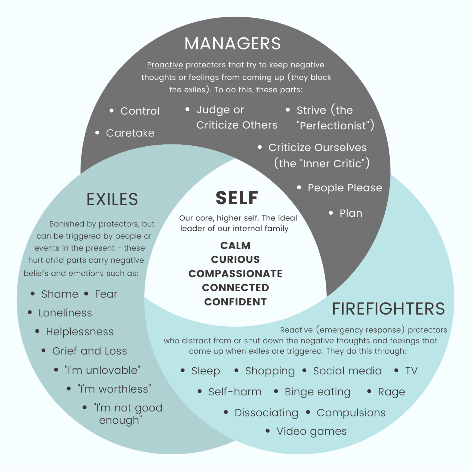 Managers: These parts are proactive. They try to protect vulnerable, exiled parts by organizing and controlling a person’s life so that their exiles are not triggered.