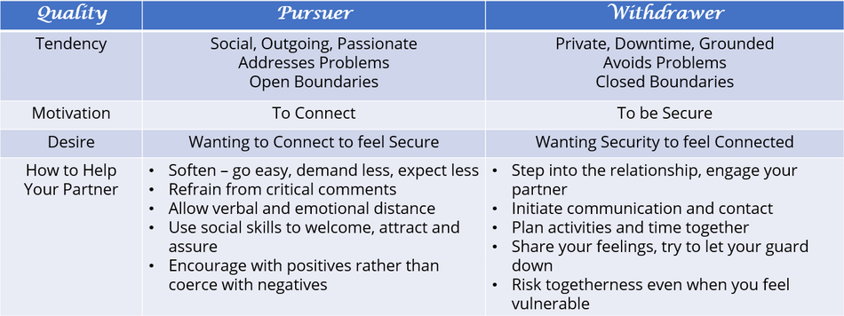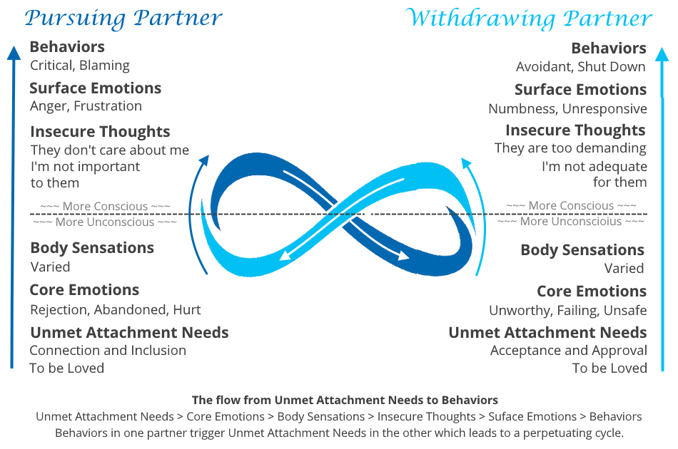 The pursuer (who tends to react emotionally and immediately) wants to tackle the issue quickly and head on so she/he can feel secure again, while the withdrawer (who prefers to think about things at their own pace or to use compulsive behaviors to avoid emotions) finds the intensity overwhelming and shuts down, which is usually the withdrawers default position. The pursuer perceives the withdrawer’s retreat as inaction or may believe that their withdrawer partner has become disinterested. As the pursuer becomes more anxious, the intensity of the pursuit increases, which leads to the withdrawer feeling more overwhelmed and withdrawing further out of reach.